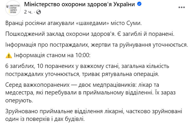 Число жертв после двойного удара "Шахедами" по больнице в Сумах увеличилось до девяти человек