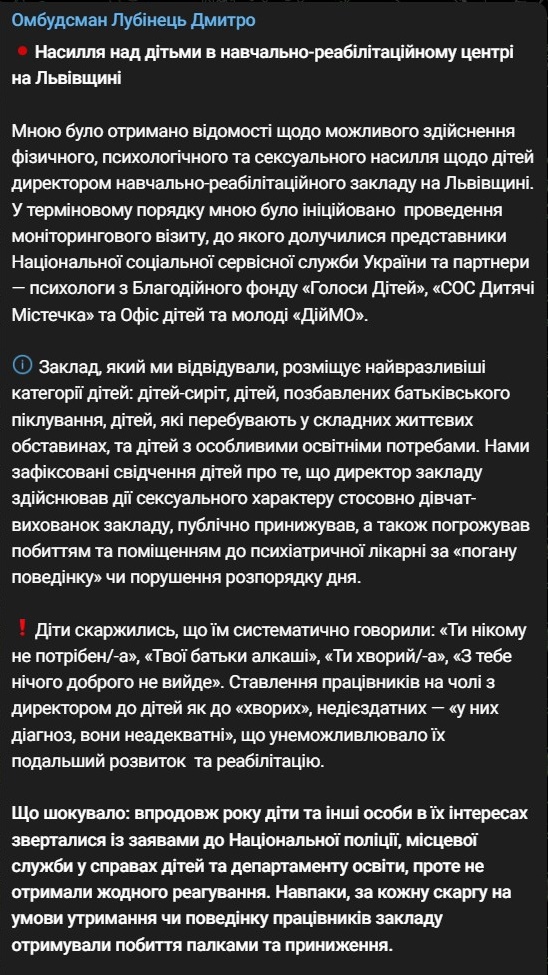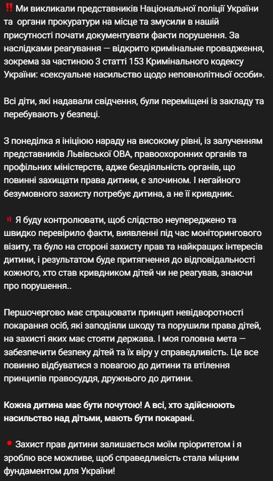 "Мною были получены сведения о возможном осуществлении физического, психологического и сексуального насилия в отношении детей директором учебно-реабилитационного учреждения Львовской области", - написал он.