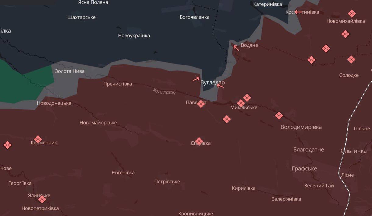 На карте ресурса Deep State восточная часть города отмечена как серая зона. Также отмечено продвижение россиян по флангам к северу от Угледара.