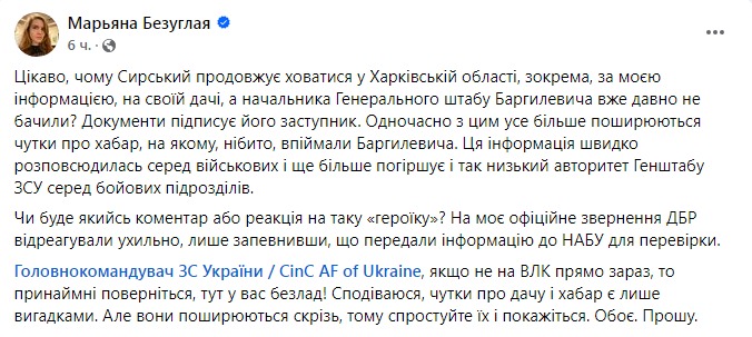 "Интересно, почему Сырский продолжает прятаться в Харьковской области, в частности, по моей информации, на своей даче, а начальника Генерального штаба Баргилевича уже давно не видели? Документы подписывает его заместитель. Одновременно с этим все больше распространяются слухи о взятках, на которых якобы поймали Баргилевича. Эта информация быстро распространилась среди военных и еще больше усугубляет и так низкий авторитет Генштаба ВСУ среди боевых подразделений", - сказано в посте Безуглой.