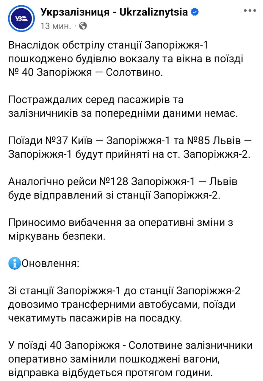 10:08 Одной из целей российских авиабомб в Запорожье стала железнодорожная станция "Запорожье-1".