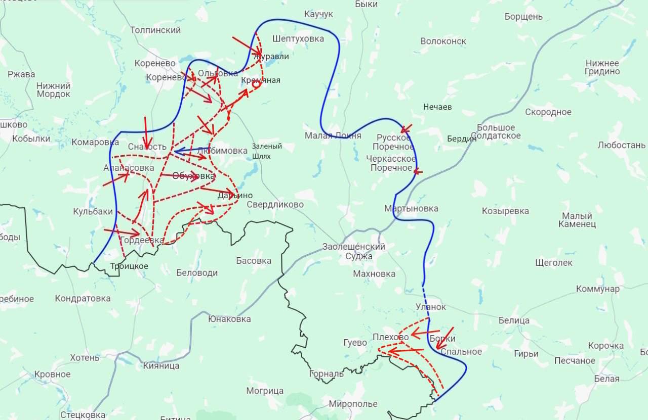 Во-первых, атакованы украинские позиции южнее Глушково с намерением отбросить ВСУ за пределы границы. Второе направление атаки - село Плехово к югу от Суджи, где это удерживаемое Украиной село, как заявляется, пытаются окружить, отрезав его от границы. Также сегодня российские паблики сообщили, что ВСУ вытеснены из Ольговки под Коренево.
