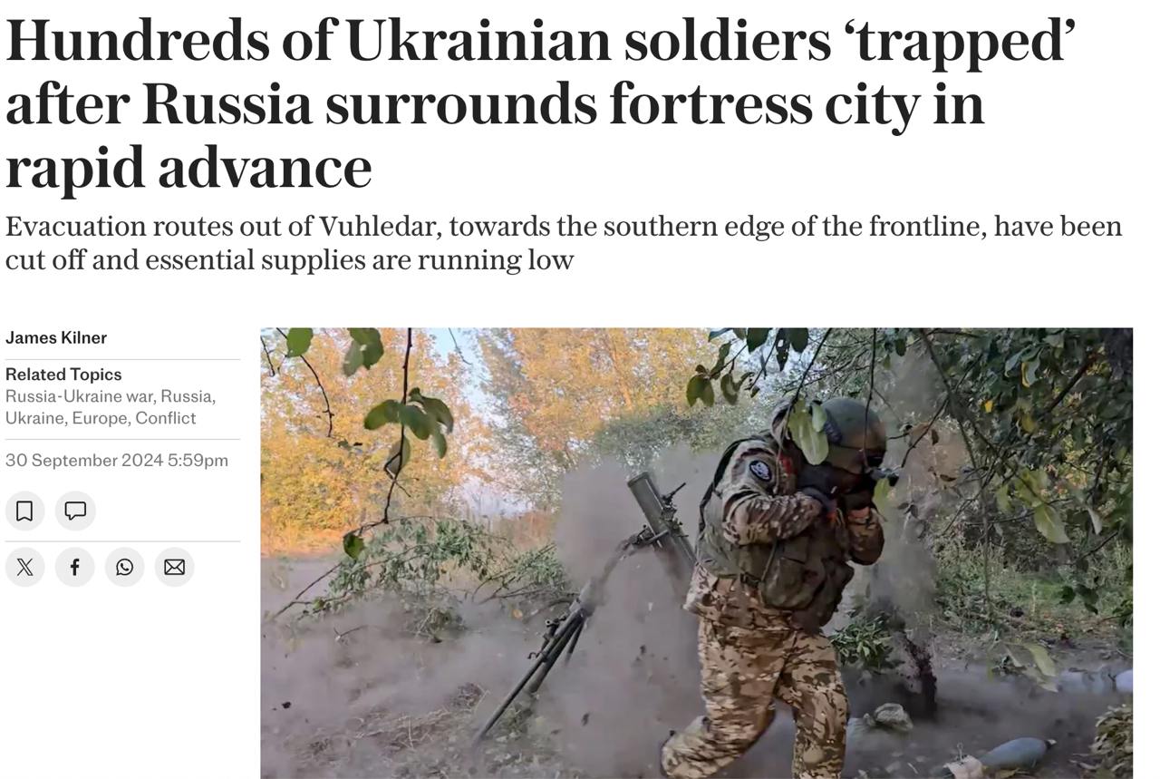 А, по данным британской The Telegraph, сотни украинских военных оказались в Угледаре " в ловушке", так как пути эвакуации из города отрезаны, а запасы продовольствия, боеприпасов и топлива уже на исходе.