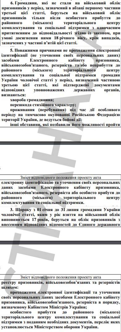 Согласно тексту проекта, с 1 января по 31 июля граждане, которым в год взятия на учет исполняется 17 лет, должны пройти электронную идентификацию персональных данных в Электронном кабинете призывника, военнообязанного, резервиста. Или лично явиться в ТЦК с перечнем документов, установленных Минобороны.