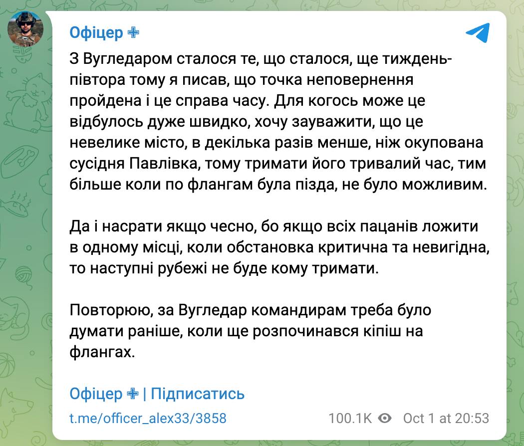 "С Угледаром произошло то, что произошло, еще неделю-полторы назад я писал, что точка невозврата пройдена и это дело времени. Если всех пацанов ложить в одном месте, когда обстановка критическая и невыгодная, то следующие рубежи некому будет держать. Об Угледаре командирам надо было думать раньше, когда еще начинался кипиш на флангах", - пишет военный.