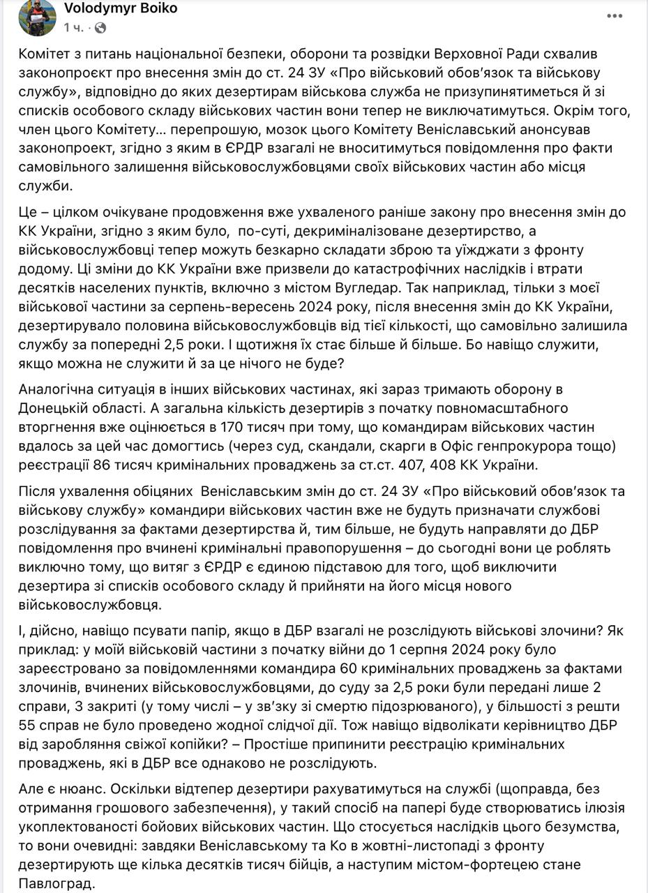 "Только из моей воинской части за август-сентябрь 2024 года, после внесения изменений в УК Украины, дезертировала половина военнослужащих от того количества, которое самовольно оставило службу за предыдущие 2,5 года. И каждую неделю их становится больше и больше. Ибо для чего служить, если можно не служить и за это ничего не будет?" - пишет Бойко.