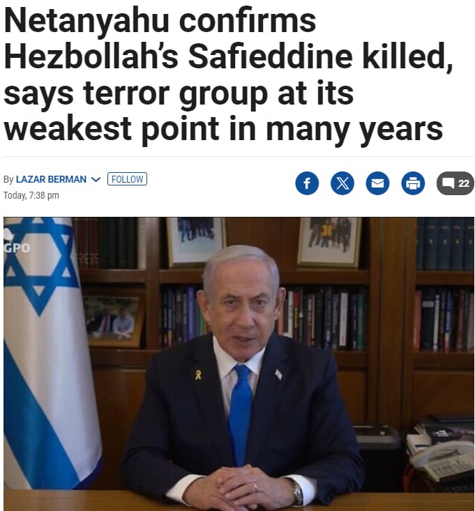 Нетаньяху подтвердил, что Хашим Сафи ад-Дин был убит в результате авиаудара в прошлый четверг. По словам премьера, израильские военные также убили преемника Сафи ад-Дина. Его имени он не назвал.