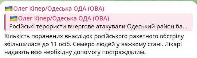23.57 Число раненых в результате российского ракетного удара по порту в Одесской области увеличилось до 11 человек, сообщил глава местной военной администрации Олег Кипер.