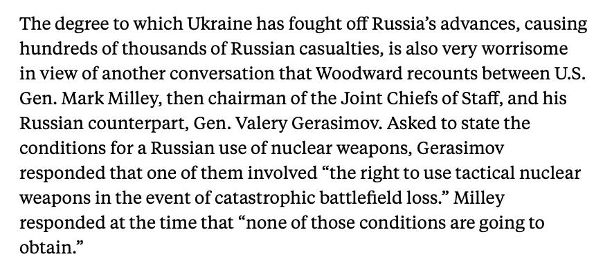 Когда Марк Милли спросил Валерия Герасимова, какие условия необходимы для применения Россией ядерного оружия, Герасимов ответил, что одно из них — "право использовать тактическое ядерное оружие в случае катастрофических потерь на поле боя".