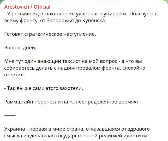 Такое мнение высказал в своем телеграм-канале экс-советник Офиса президента Алексей Арестович.