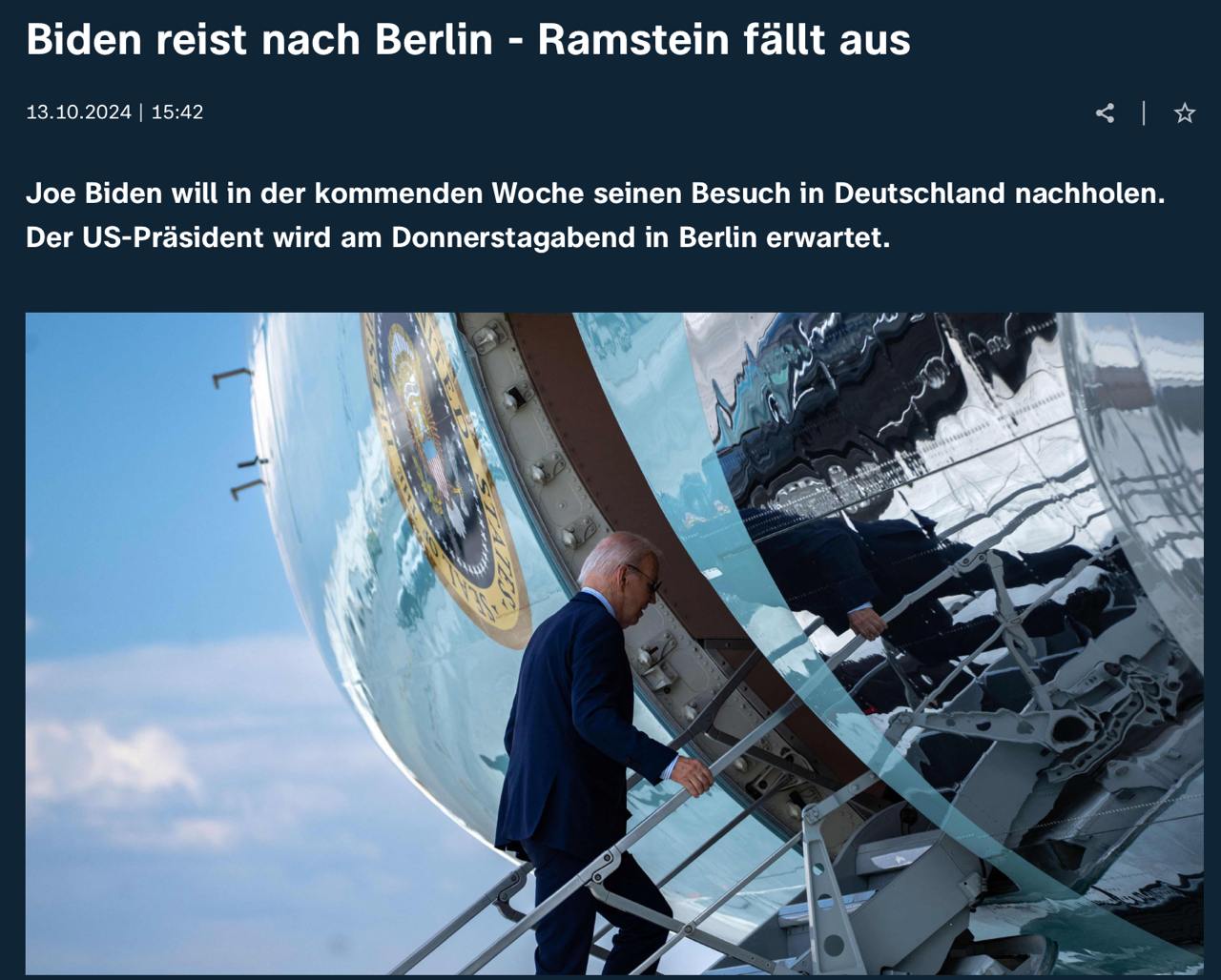 "Поездка Байдена в Берлин будет своего рода прощальным визитом президента перед предстоящими в начале ноября выборами. <...> Тем не менее, запланированный теперь короткий визит будет посвящён тем же политическим вопросам: дальнейшим действиям западных союзников Украины и войне на Ближнем Востоке", – говорилось в материале.