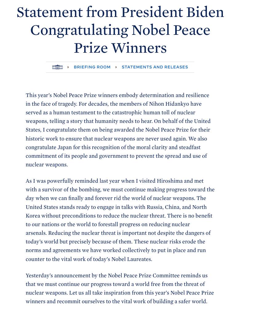 Заявление в целом было посвящено лауреатам Нобелевской премии мира, которых поздравил американский президент. Премию в этом году получила японская организация за ядерное разоружение.
