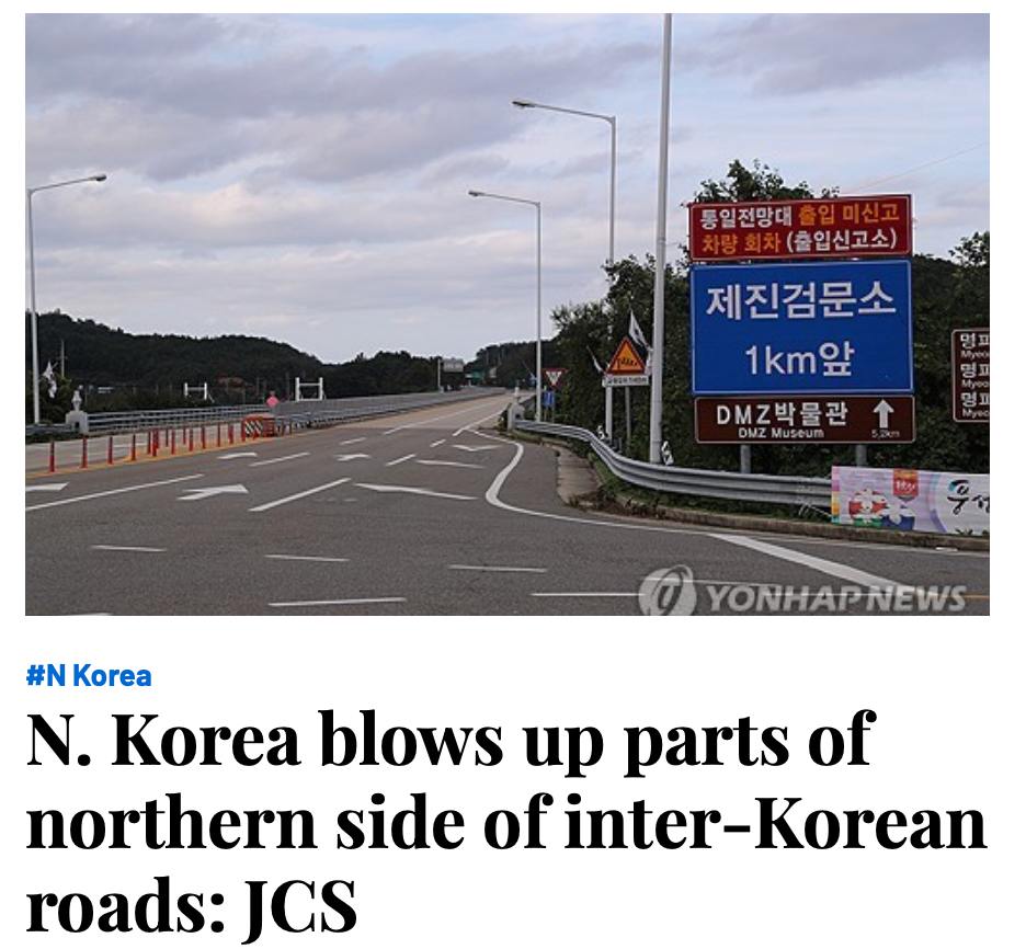 "Северная Корея взорвала участки дорог Кёнги и Тонхэ к северу от военной демаркационной линии около полудня", - цитирует агентство генштаб Южной Кореи.