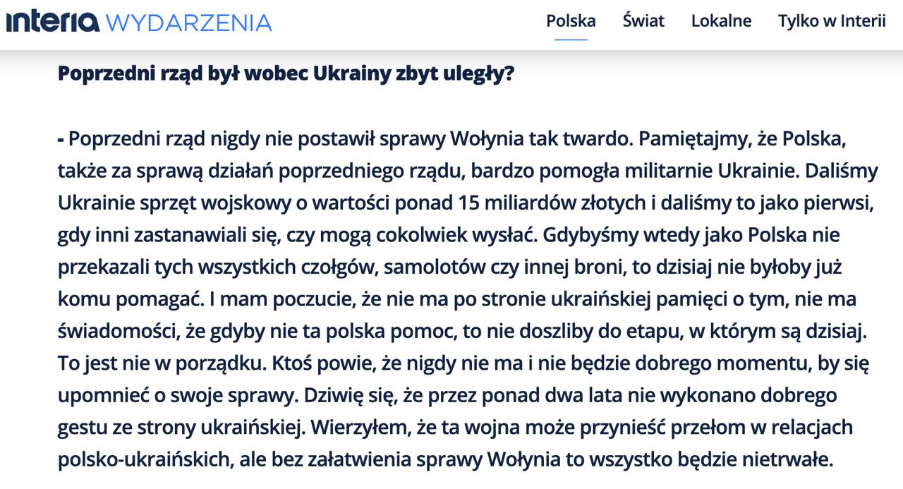 Он также снова поднял тему Волынской резни и обвинил Украину в том, что за два года она не сделала "ни одного хорошего жеста" в этом направлении, а сейчас Киев, по его мнению, недостаточно ценит помощь Варшавы.