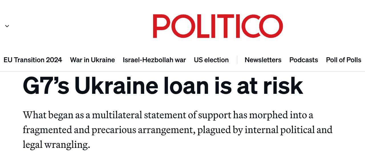 "То, что начиналось как многостороннее заявление о поддержке осаждённой страны, теперь превратилось в раздробленную и шаткую договорённость, терзаемую внутренними политическими и юридическими препирательствами. А сам кредит - изначально задуманный как безрисковый для кредиторов G7 - сталкивается с реальным риском провала, если не будут приняты срочные меры", - пишет он.