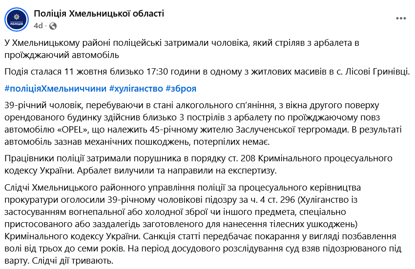 "39-летний мужчина, находясь в состоянии алкогольного опьянения, из окна второго этажа арендованного дома произвел около трех выстрелов из арбалета по проезжающему мимо автомобилю OPEL, принадлежащего 45-летнему жителю Заслученской территориальной общины. В результате автомобиль получил механические повреждения, пострадавших нет", - говорится в сообщении.
