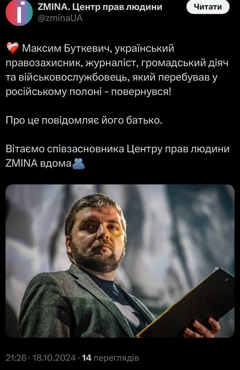 В то же время издание ZMINA сообщило, что в рамках обмена в Украину вернули правозащитника, соучредителя Центра прав человека ZMINA Максима Буткевича.