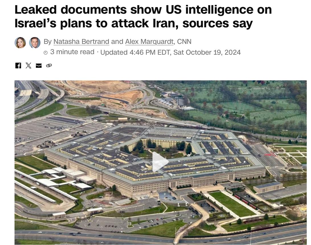 В США произошла утечка секретных данных о подготовке удара Израиля по Ирану. Документы были опубликованы в Telegram позавчера, 18 октября. В США начали расследование по этому поводу.