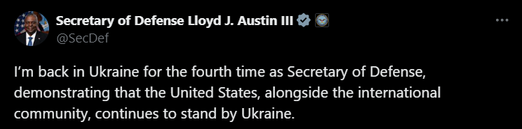 "Я вернулся в Украину в четвертый раз в качестве министра обороны, продемонстрировав, что Соединенные Штаты вместе с международным сообществом продолжают поддерживать Украину", - написал он в соцсети Х.