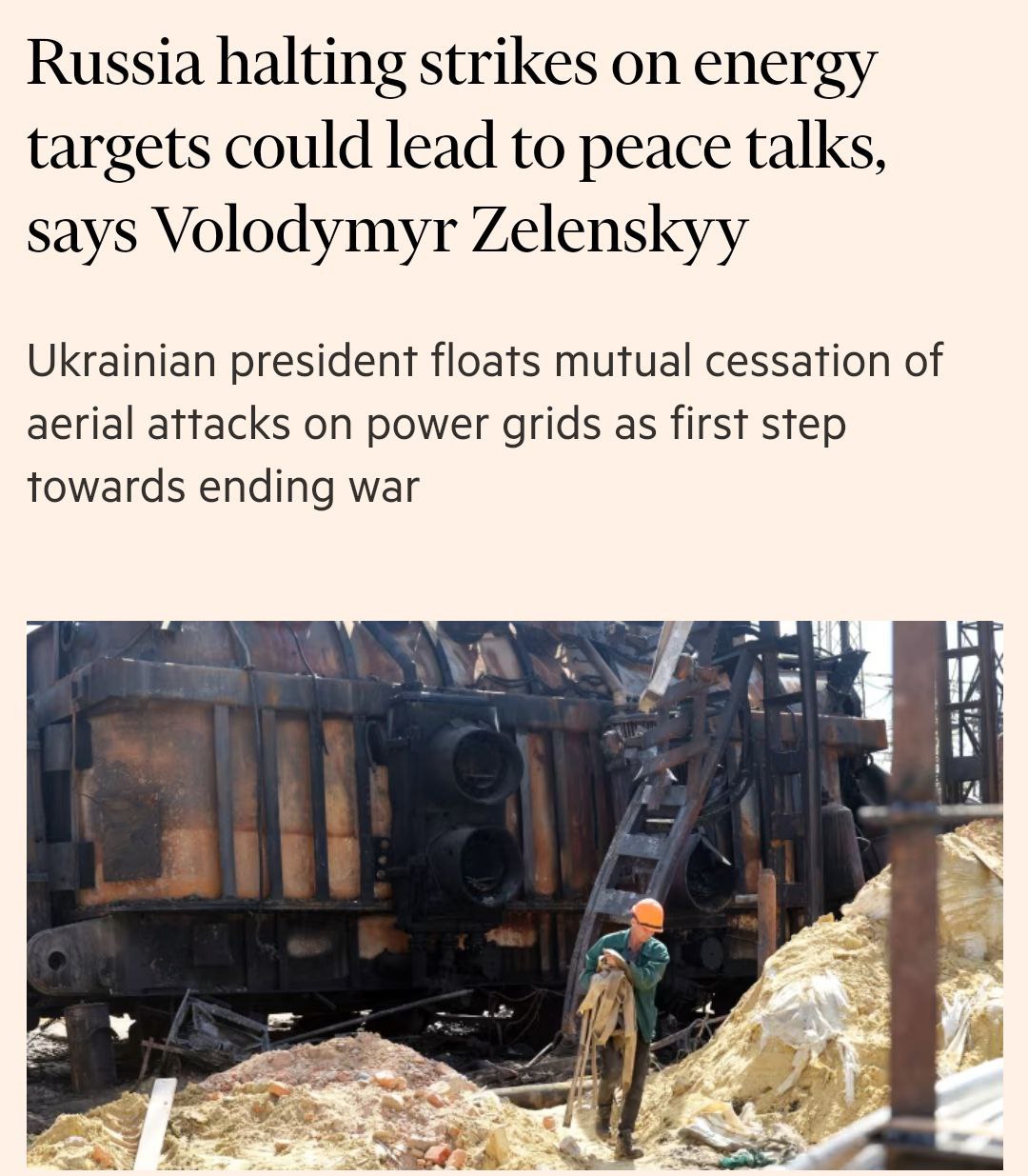 "Заявление Зеленского о том, что взаимное прекращение ударов Украины и России по энергообъектам друг друга могло бы стать "первым шагом к завершению горячей фазы войны", формально тянет на сенсацию.