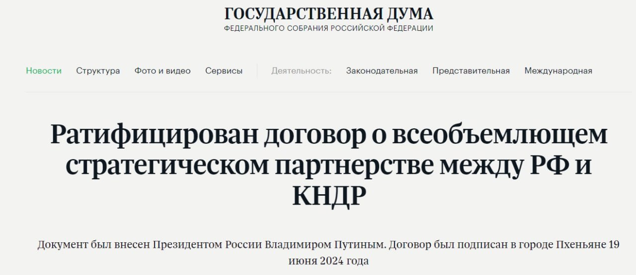 Госдума РФ ратифицировала договор о всеобъемлющем стратегическом партнёрстве между Россией и КНДР. Документ был внесён в парламент президентом России Владимиром Путиным.