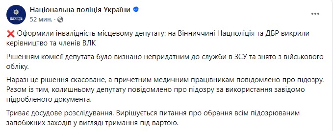 По данным следствия, семейный врач без проведения исследований выдал депутату заключение о якобы наличии у него цирроза печени. В начале 2023 года на основании этого медицинского документа военно-врачебная комиссия одного из районных ТЦК признала Жеребнюка непригодным к военной службе, его сняли с военного учета. Справка о непригодности открывала ему путь для побега за границу, но мужчина не успел выехать.