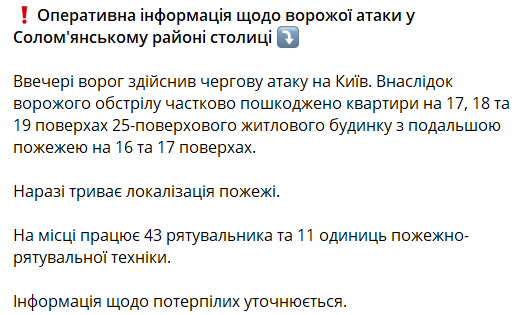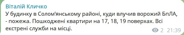Мэр Киева Виталий Кличко заявил, что попадание дрона произошло в Соломенском районе города. Возник пожар. По его словам, пострадали квартиры на 17,18 и 19 этажах. На месте работают экстренные службы.