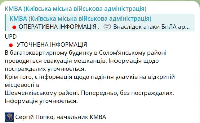 В свою очередь глава Киевской городской военной администрации Сергей Попко заявил, что из киевской многоэтажки, в которой после попадания горят две квартиры, эвакуируют жителей.
