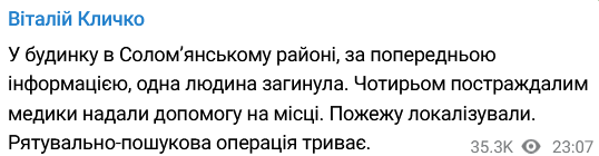 "В доме в Соломенском районе, по предварительной информации, один человек погиб. Четверым пострадавшим медики оказали помощь на месте. Пожар локализовали. Спасательно-поисковая операция продолжается", - написал Кличко.