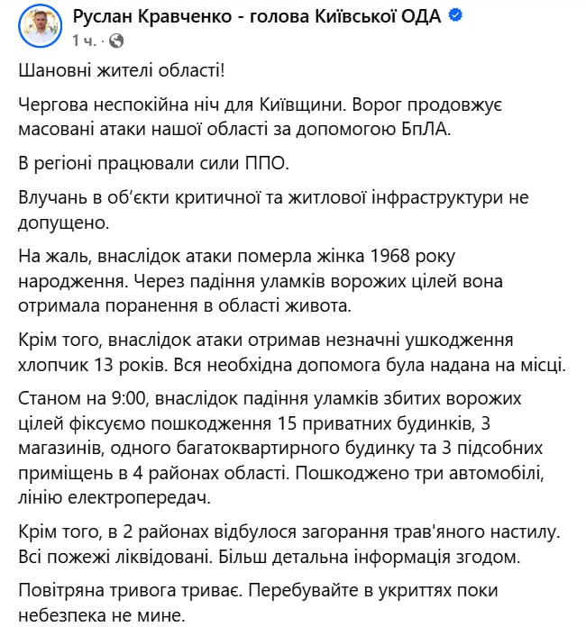 Этой ночью Киевскую область россияне атаковали ударными БПЛА. Погибла женщина. Повреждены жилые дома.