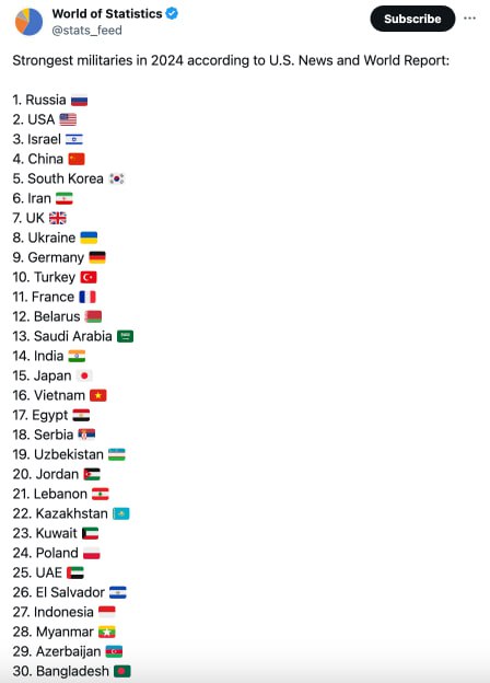 По каким критериям расставлены армии в рейтинге и почему российская армия стоит выше американской, а израильская выше китайской, не поясняется.