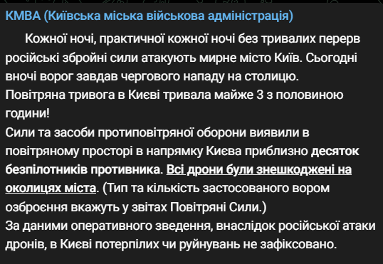 08:20 Ночью россияне атаковали Киев ударными дронами. Воздушная тревога длилась почти 3 с половиной часа. Об этом сообщает КГВА.