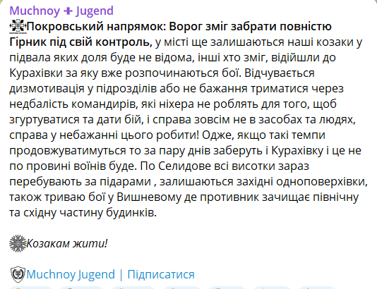 Украинский военный с позывным "Мучной" сообщает о потере Горняка Донецкой области. Вчера об этом писали российские паблики.