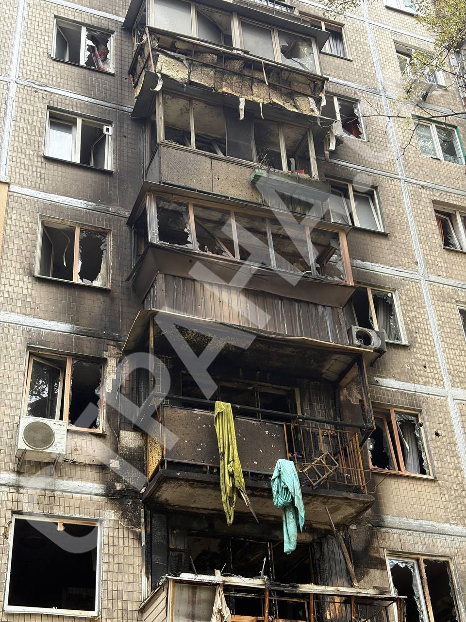 Сгоревшие балконы. "Страна" публикует кадры поврежденной после падения обломков "Шахеда" многоэтажки в Киеве