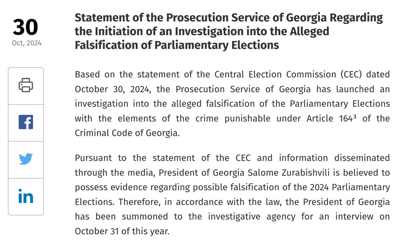 "Согласно заявлению ЦИК и информации, распространенной в СМИ, президент Грузии Саломе Зурабишвили, как предполагается, располагает доказательствами возможной фальсификации парламентских выборов 2024 года. Поэтому, в соответствии с законом, президент Грузии был вызван в следственный орган для допроса 31 октября этого года. Прокуратура Грузии проведет все необходимые следственные и процессуальные действия для изучения фактов, изложенных в заявлении ЦИК, а также упомянутых президентом Грузии, некоторыми политическими партиями и представителями миссий по наблюдению за выборами. В том числе в рамках расследования будут опрошены все лица, которые могут иметь информацию о предполагаемом правонарушении", - сказано в сообщении.
