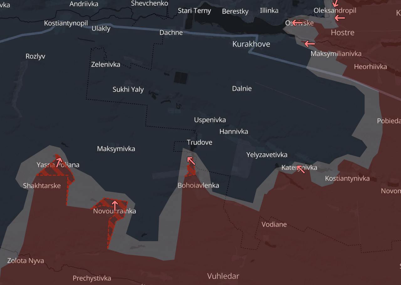 По данным паблика Deep State, они захватили Новоукраинку и Богоявленку (о чем вчера уже заявляли украинские военные и российские паблики). Со стороны Богоявленки российские войска продвинулись на север и приблизились к Трудовому (украинские военные писали вчера, что штурм села уже начался).