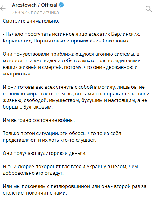 Они почувствовали приближающуюся агонию системы, в которой они уже видели себя в дамках - распорядителями ваших жизней и смертей, потому что они - "державною" и "патриоты". И они готовы вас всех утянуть с собой в могилу, лишь бы не возникло мира, в котором вы, вы сами распоряжаетесь своей жизнью, свободой, имуществом, будущим и настоящим, а не борцы с Булгаковым", - заявил Арестович.