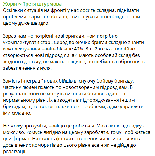 "Вместо интеграции новых бойцов в существующую боевую бригаду часть людей "толкают" во вновь созданные подразделения. В результате они не могут выполнить боевые задачи на нормальном уровне. Их выводят в подчинение другим бригадам, что создает только новые проблемы, ведь управлять ими сложно. Не могу понять, для чего это делается. Есть только догадка - возможно, кому-то выгодно на этом зарабатывать, поэтому и лоббируется этот формат. А формат создания дивизий и поднятие опытных комбригов до этого уровня все никак не дойдет до реализации", - пишет Жорин в своем телеграм-канале.