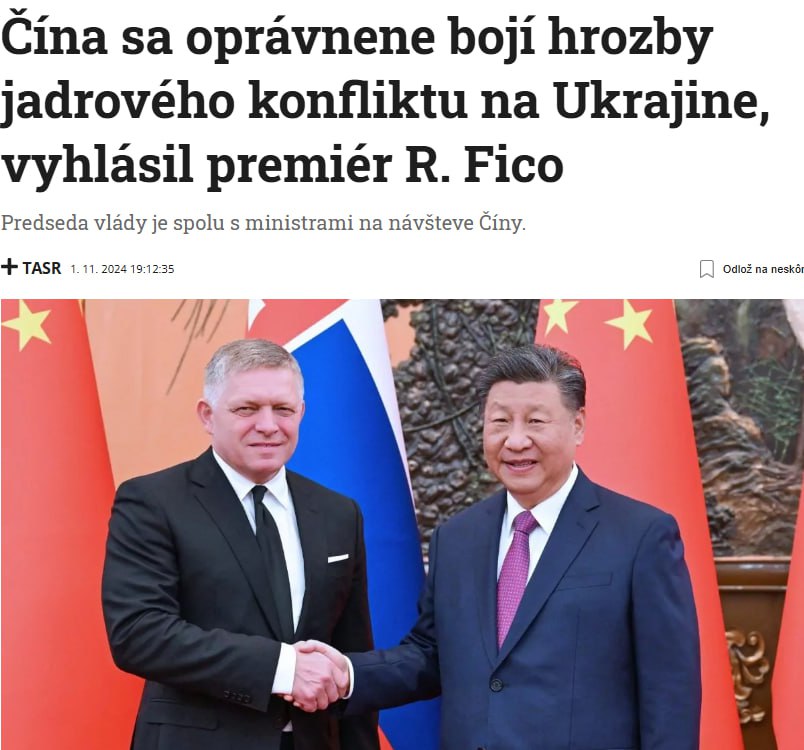 После переговоров с китайским лидером Си Цзиньпином Фицо заявил, что оба лидера разделяют мнение о "невозможности немедленного прекращения боевых действий, пока Украина продолжает получать военную и финансовую поддержку Запада для продолжения войны".