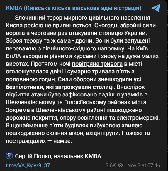 Ночная атака на Киев. Обломки "Шахедов" упали в Шевченковском и Голосеевском районах