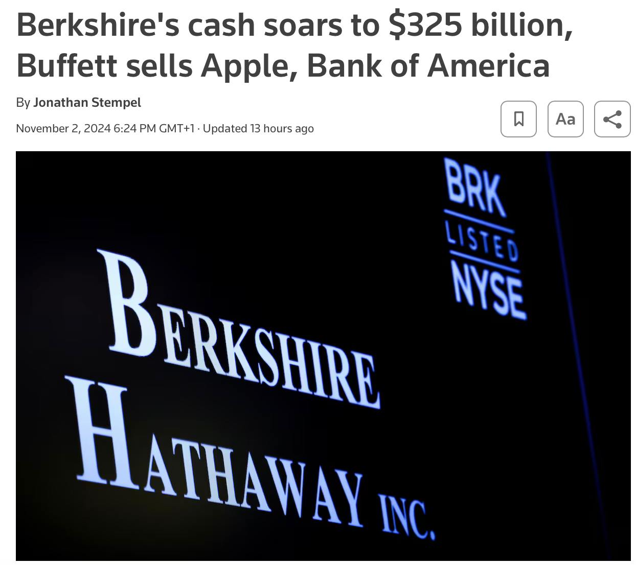 Эксперты, опрошенные Reuters, считают, что накопление наличных денег Баффетом означает "бегство от риска", "и инвесторы могут беспокоиться о том, что это означает для экономики и рынков".