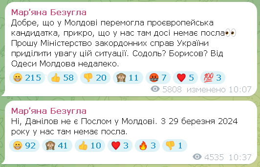 "Хорошо, что в Молдове победила проевропейская кандидатка, досадно, что у нас там до сих пор нет посла. Прошу Министерство иностранных дел Украины уделить внимание этой ситуации. Содоль? Борисов? От Одессы Молдова недалеко. Нет, Данилов не посол в Молдове. С 29 марта 2024 г. у нас там нет посла", - сказано в публикациях Безуглой.