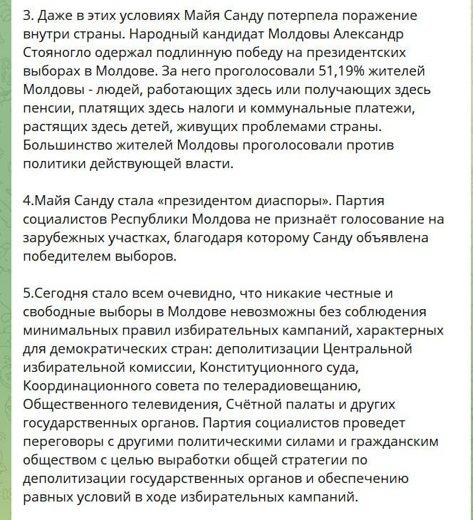 Партия социалистов Республики Молдова, от которой выдвигался юрист Александр Стояногло, назвала Майю Санду "нелегитимным президентом" и заявила о фальсификациях на выборах.