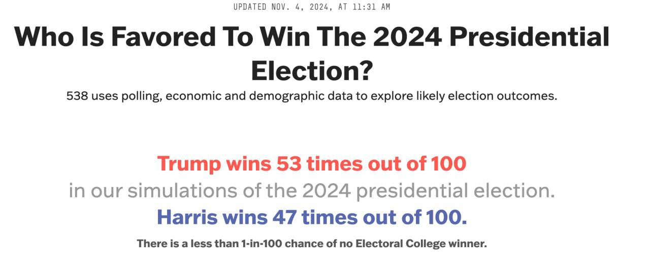 Последние данные показывают, что Трамп победит в 53 случаях из 100, тогда как у Харрис есть шансы на победу в 47 случаях. Вероятность того, что президентом станет кто-то другой - минимальная.