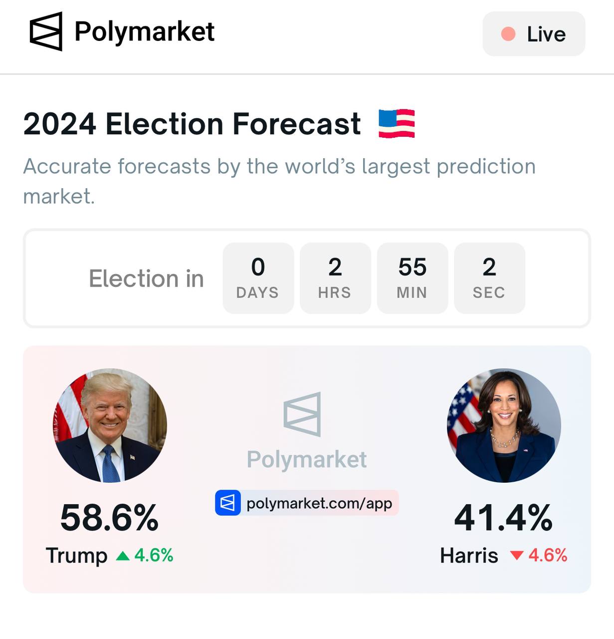 В свою очередь платформа рынков предсказаний Polymarket дает 58% на победу Трампа.