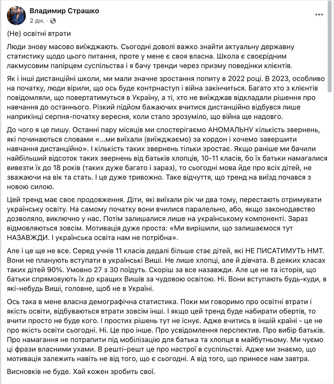 "Последние пару месяцев мы наблюдаем аномальное количество обращений, которые начинаются словами "…мы уехали (выезжаем) за границу и хотим завершить обучение дистанционно". Речь идет обо всех детях, несмотря на возраст и пол. Среди учащихся 11-х классов все больше становится детей, которые не будут писать НМТ (национальный мультипредметный тест - Ред.). Они не планируют поступать в украинские вузы. Не только ребята, но и девушки. В некоторых классах таких детей 90%. Условно 27 из 30 уедут. Скорее всего, навсегда. Они поступают куда угодно, в какие-нибудь вузы, главное, чтобы не в Украине", - написал Страшко.