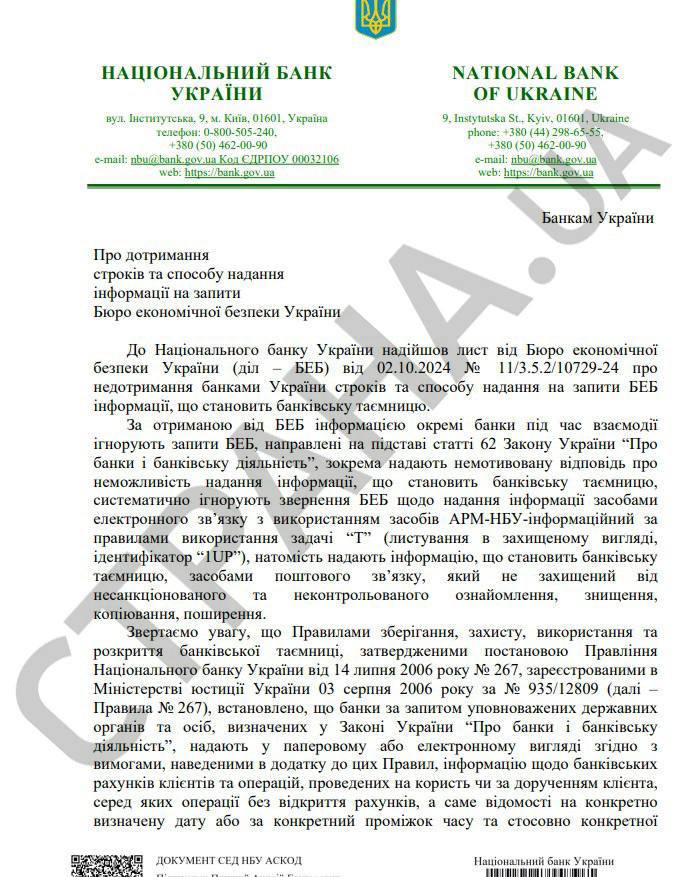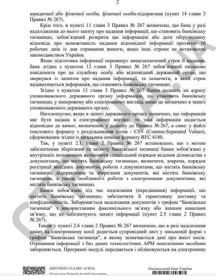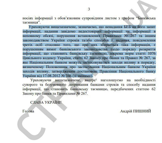 "Учитывая вышесказанное, отмечаем, что непредоставление БЭБ по его запросу информации, предоставление заведомо недостоверной информации или информации в неполном объеме, нарушение установленных правилами №267 и другим законодательством Украины сроков и/или способов ее предоставления, уведомления третьих лиц относительно того, что о них собирается такая информация, есть нарушением требований банковского законодательства о порядке раскрытия информации, составляющей банковскую тайну, в том числе норм статьи 1076 Гражданского кодекса Украины, статьи 62 закона о банках и правила № 267, по которому Национальным банком могут применяться меры воздействия", - говорится в письме №24-0006/81883.