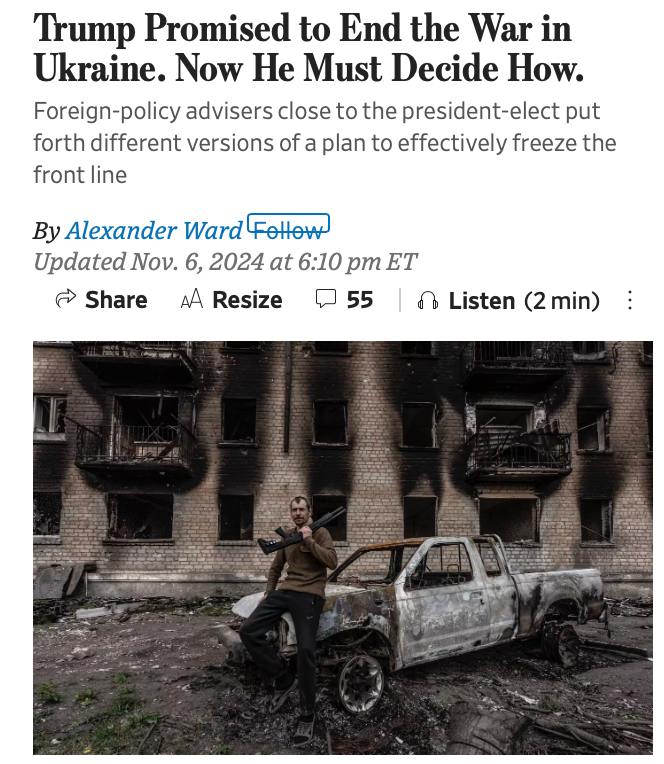 Трамп еще не утвердил конкретный мирный план, и различные фракции будут бороться за влияние на его внешнюю политику. Но сам избранный президент "стремится как можно скорее закончить войну, даже если это означает принуждение Киева к значительным уступкам".
