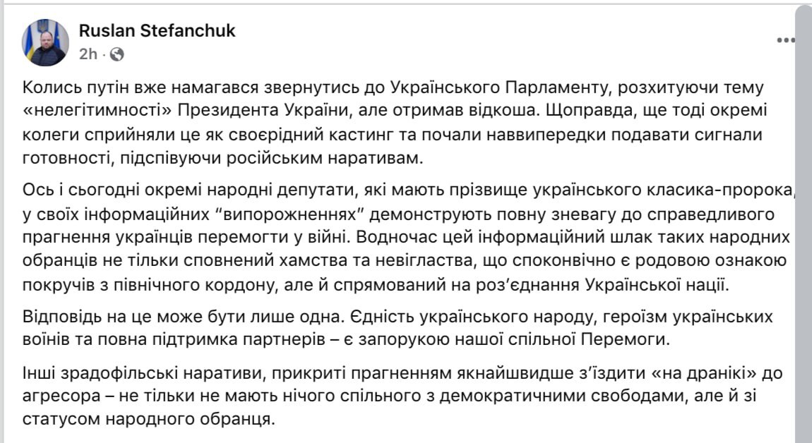 Спикер Верховной Рады Руслан Стефанчук считает, что депутат, призвавший к переговорам с РФ, не соответствует статусу народного избранника.
