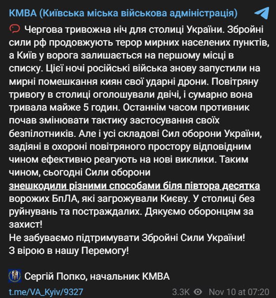 Силы обороны обезвредили разными способами около полутора десятков враждебных БПЛА, летевших на Киев. В столице без разрушений и пострадавших.